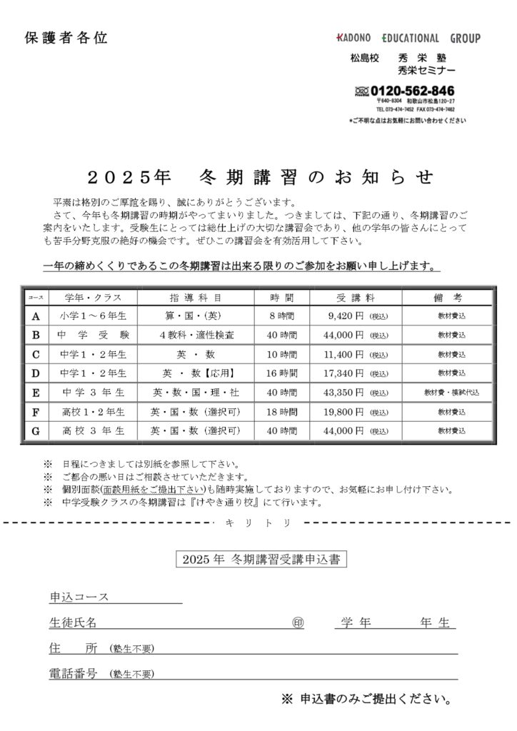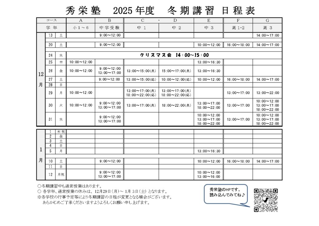 受験生以外の学年の皆さんも今学年の集大成です。しっかり復習して次の学年に繋げていくためにも、この冬の過ごし方を考えましょう。